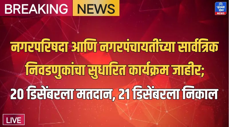 Read moreमुंबई: बहुचर्चित आणि काही कारणांमुळे प्रलंबित असलेल्या नगरपरिषदा आणि नगरपंचायतींमधील सार्वत्रिक निवडणुकांसाठी राज्य निवडणूक आयोगाने सुधारित निवडणूक कार्यक्रम-२०२५ जाहीर केला